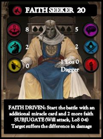 Small skirmishes: Each player chooses a faction and 30 points worth of units (2-4 units on average) to compose their faith warband to go on a pilgrimage to unite the people. The captain chooses one faith card that gives him access to various miracles to influence the battle.