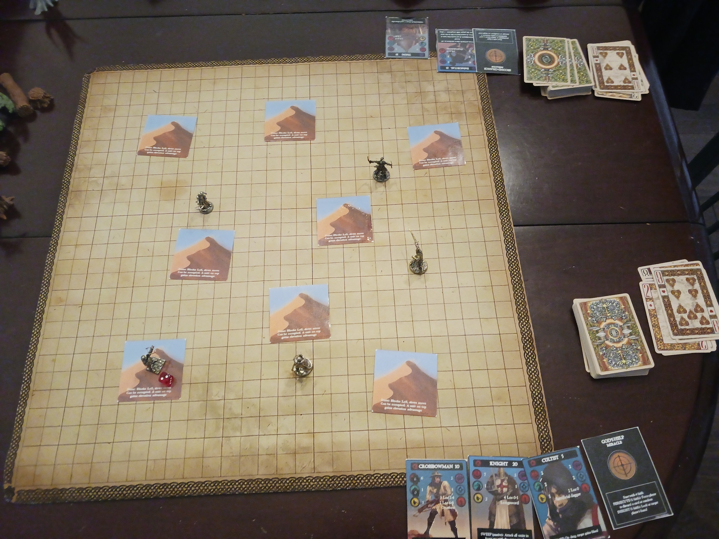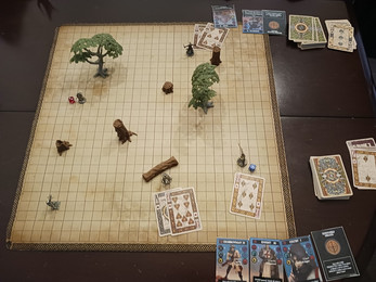 Playing cards: Play up to two cards when determining initiative, movement, attack, and defense. Numbered cards are worth 1, figure cards are worth 2. Spades apply +1 to attacks, diamonds: +1 to initiative, clubs: +1 to movement, hearts: +1 to defense. If you play a pair: Apply +2 extra,