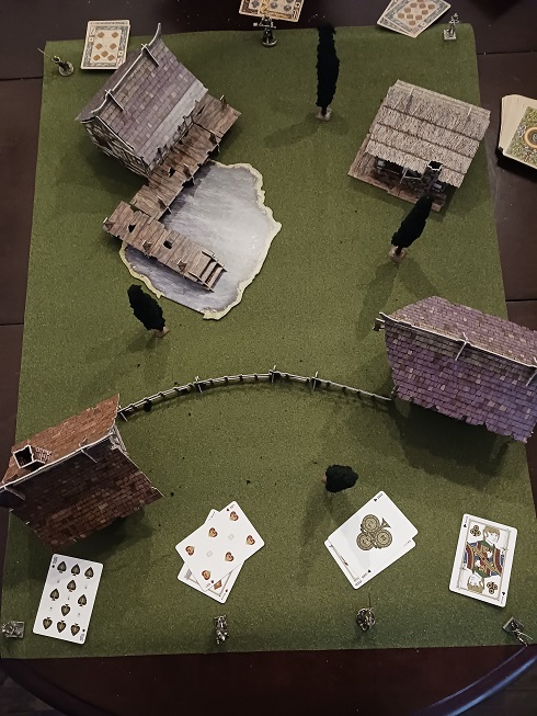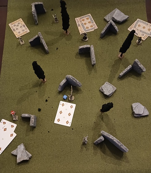 - Move: Gain movement points (MP) equal to the played cards + Move stat. Use the short edge of a playing card as your 2 MP ruler. MP are used to nock arrows, reload, loot, etc.